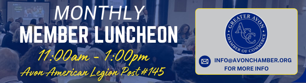 The Avon Chamber of Commerce hosts its Members Luncheon on the 4th Tuesday of each month (except August and December). Registration and networking begin at 11:00am, with announcements at noon. Members may share business updates—please notify us in advance.