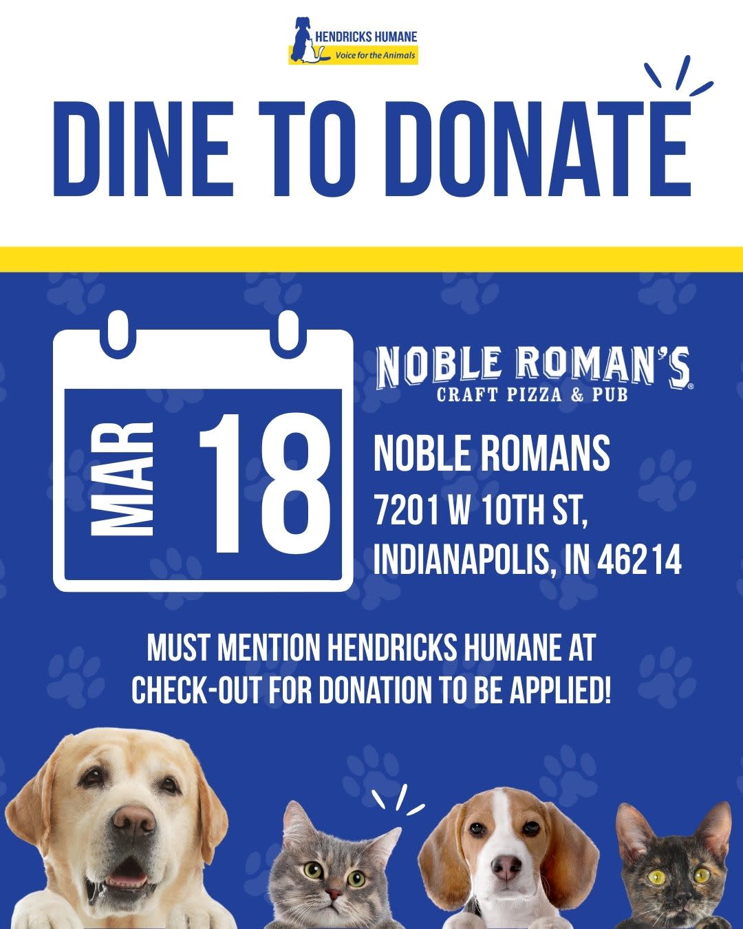 Dine to Donate at Noble Roman's Avon location 7201 W 10th St, Indianapolis. Mention to server or at carry out that you are supporting Hendricks Humane Society and Noble Roman's donates 15% of your bill to Hendricks Humane.