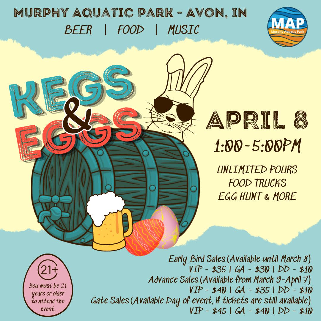 Washington Township Parks, in partnership with Indiana On Tap, is excited to present the inaugural "Kegs & Eggs" Craft Beer Fest + Adult Easter Egg Hunt on Saturday, April 8th from 1pm - 5pm at the beautiful Murphy Aquatic Park In Avon. This exciting new event will feature UNLIMITED SAMPLES & POURS from 15+ Indiana craft breweries, wineries & distilleries from all over the state, as well as an adult Easter Egg hunt with prizes. All attendees will receive a tasting cup when they arrive to enjoy as many of the estimated 75+ unique beers, wines, and spirits as they would like (while meeting and getting to know these breweries/wineries/distilleries and their own unique stories along the way). GREAT MUSIC will complement the event and great food will be available for purchase from multiple food trucks! Join us for more than just kegs with our eggciting events! First, will be our egg hunt—collect as many as you can in hopes of winning one of our raffle prizes! Who knows? You might come across a golden egg. Next will be our egg race as competitors will maneuver through a series of obstacles while balancing an egg on a spoon. Whoever completes the course first—without dropping the egg, wins. Come out and enjoy one of the very few craft beer, wine & spirits festivals that takes place in this part of central Indiana! Make no mistake, this festival is going to be a party that you absolutely don't want to miss!